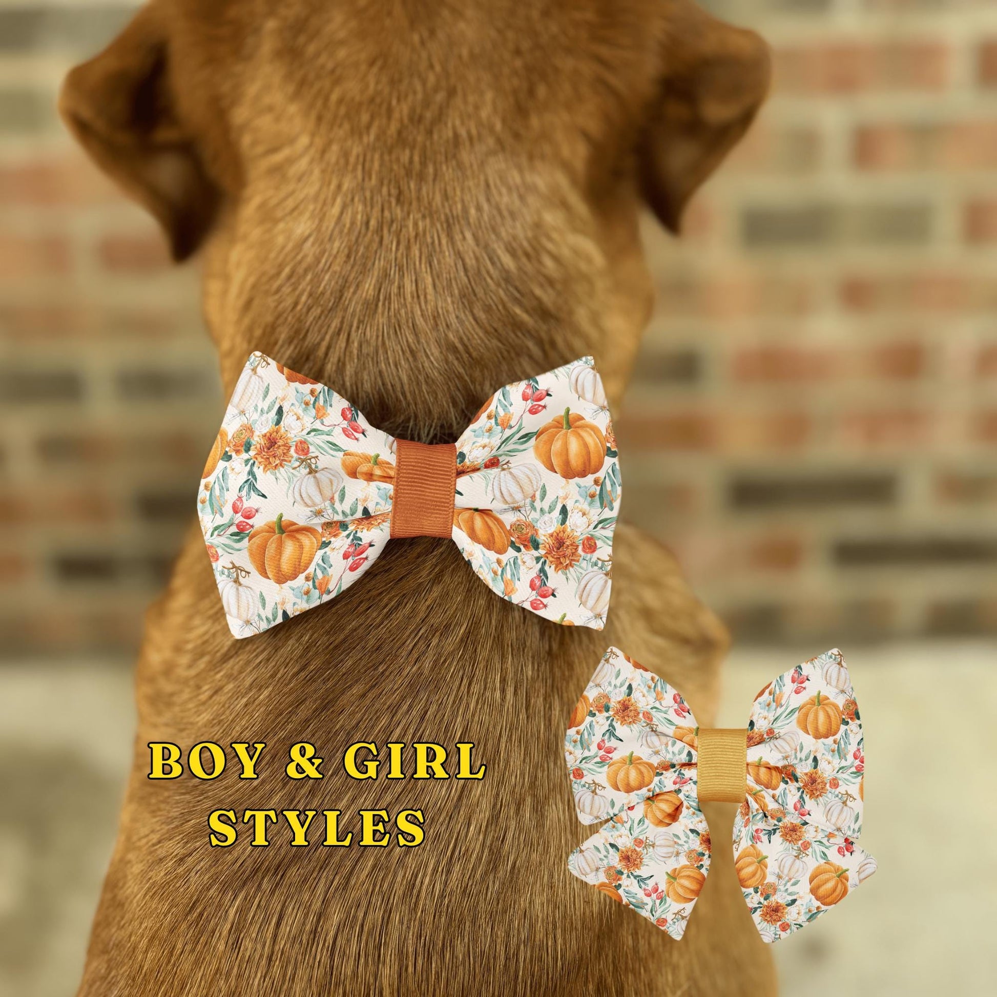 Elevate your pet's style this season with our Autumn Bloom Pumpkins Bow Tie, a stunning pet accessory inspired by the warmth and charm of fall. This exquisite bow showcases a beautiful watercolor arrangement featuring large orange and white pumpkins mingled with vibrant dahlias, roses, and delicate blossoms, all set against a soft cream background. Perfect for both dogs and cats, our slip-on bow tie is crafted from high-quality, water-resistant polyester that ensures a full and puffy appearance, adding an eye-catching touch to any pet's collar. With 21 ribbon colors to choose from and sizes for both boys and girls, this bow tie captures the essence of the harvest season while offering a whimsical, yet refined look for your furry friend.