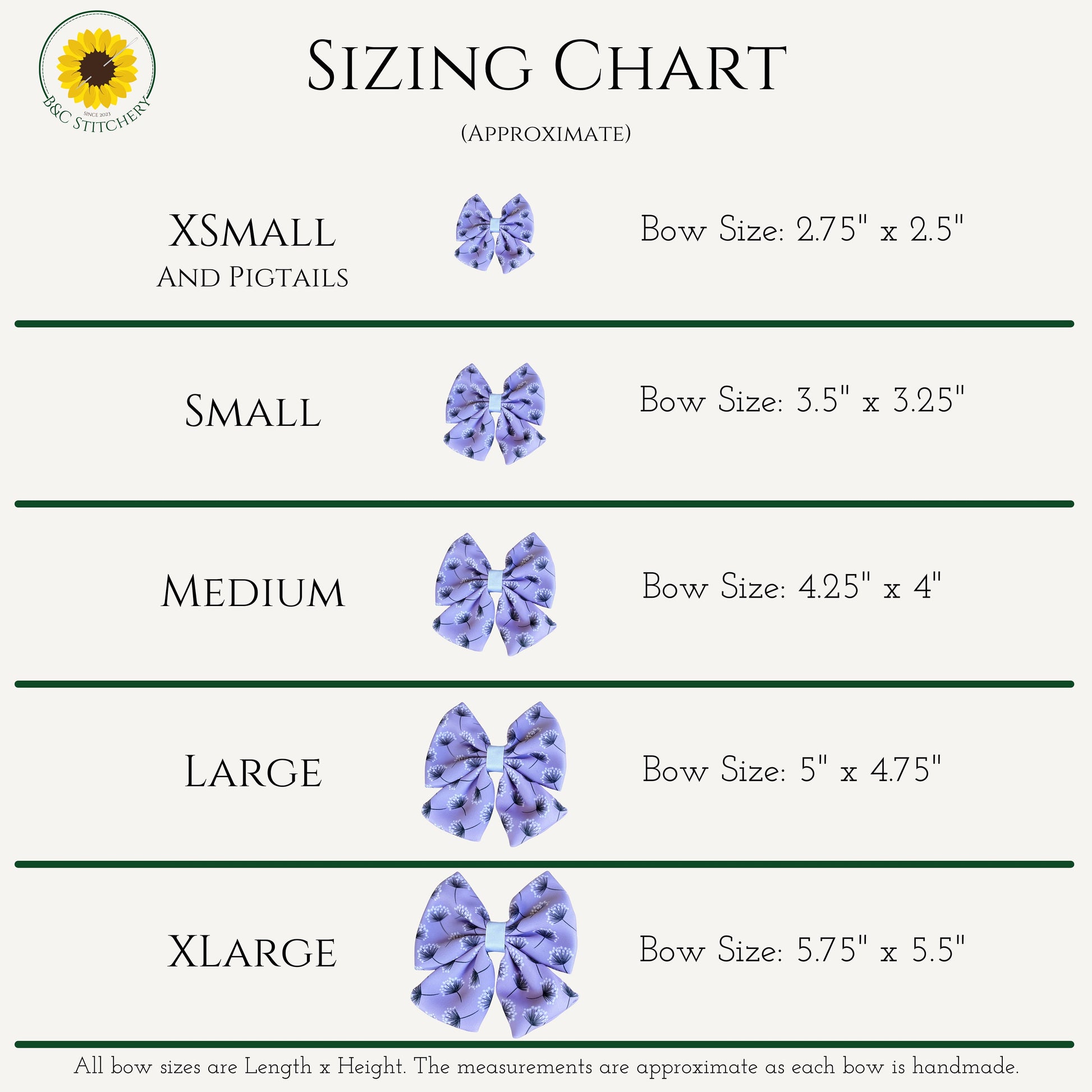 • 𝐒𝐢𝐳𝐢𝐧𝐠: XSmall (2.75"x2.5"), Small (3.5"x3.25"), Medium (4.25"x4"), Large (5"x4.75"), XLarge (5.75"x5.5"), and Pigtails (two XSmall bows)*