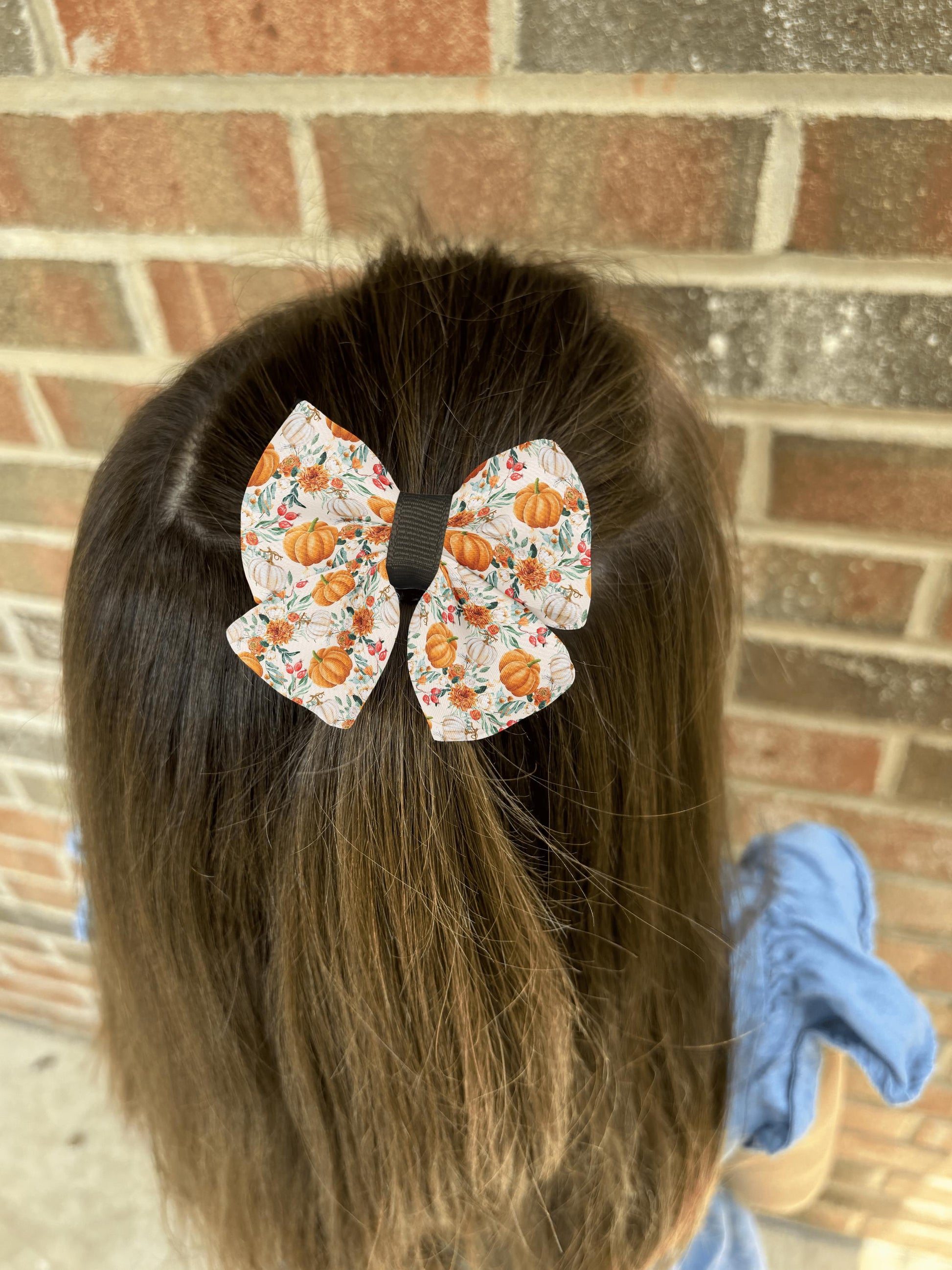 Autumn Bloom Pumpkins Hair Bow with Floral Design • 21 Color Options • Rustic Fall Accessories • Girl Hair Bow • Women Hair Bow • Handmade