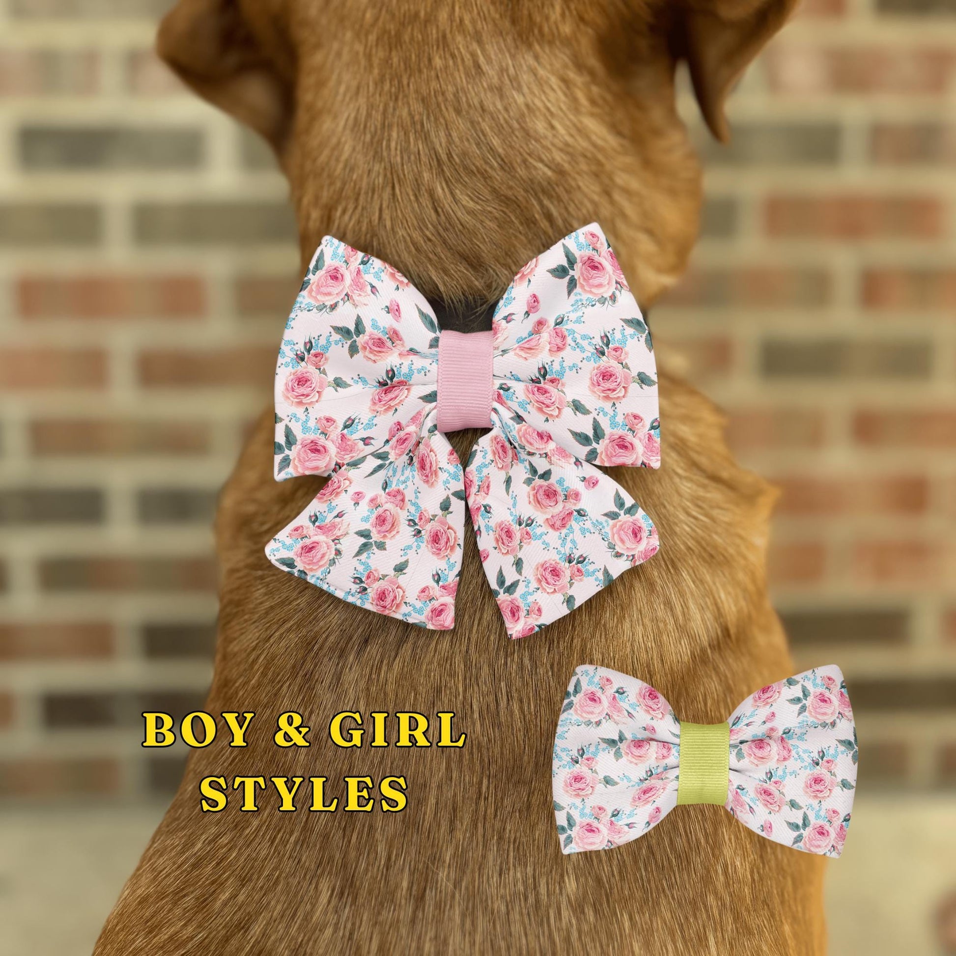 Enhance your furry friend's wardrobe with the enchanting Rose Elegance Slip-On Pet Bow Tie. Featuring a delicate floral pattern with lifelike soft pink roses and contrasting vibrant blue forget-me-nots, this charming accessory adds a touch of sophistication to any pet's attire. Crafted from high-quality, water-resistant polyester, it offers a puffy, full appearance and easy-to-use elastic loops for hassle-free attachment to any collar. With 21 vibrant ribbon colors and sizes available for both boys and girls, this bow tie is the perfect blend of style and functionality, ensuring your pet stands out on any occasion.